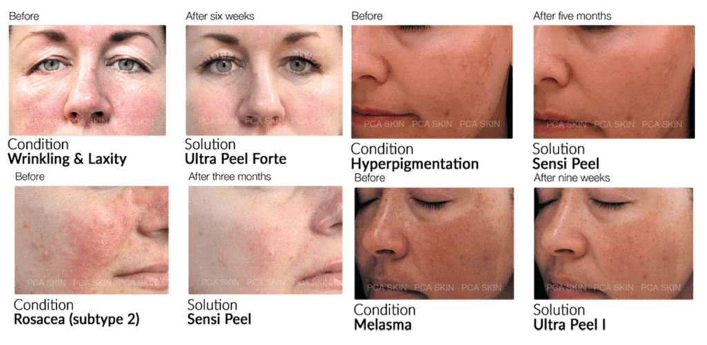 PCA Peels are ideal for addressing a variety of skin concerns, including uneven skin tone, fine lines and wrinkles, dullness, poor skin texture, pigmentation or discoloration, melasma, rosacea, acne-prone skin, and signs of aging. These peels utilize a specialized layering technique to apply different acid blends carefully, ensuring effective treatment without excessive irritation. All PCA peels are self-neutralizing, which means they minimize the risk of burns by avoiding excessive concentration on sensitive facial areas.